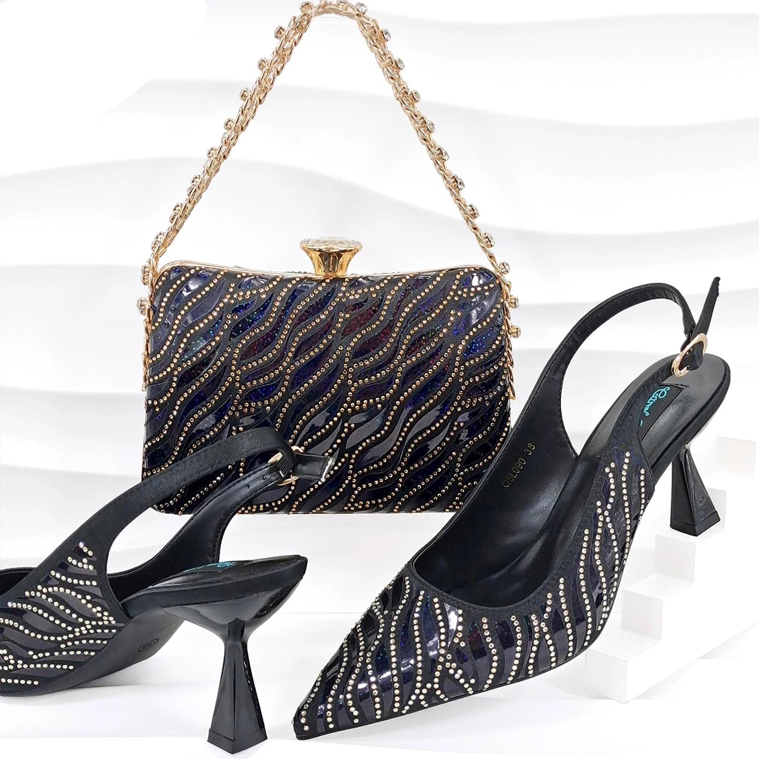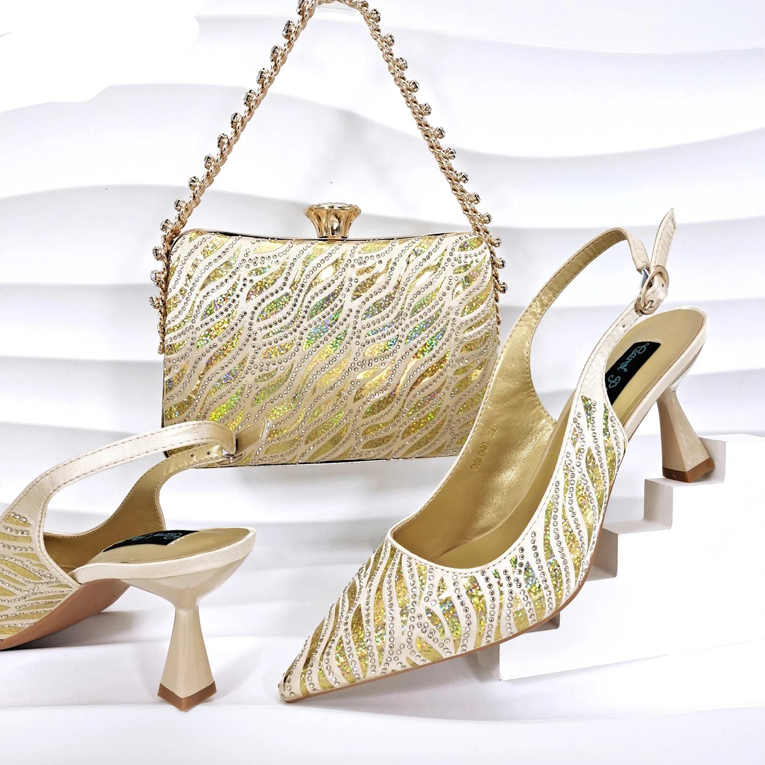 Step into elegance with this stunning set of high heels and a matching bag. Featuring a full diamond design and a sleek silver color, these pumps are perfect for weddings and parties. The set offers a blend of style and comfort, making it a must-have for any fashion-forward woman.